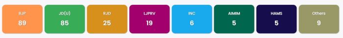 એનડીએના સહયોગી ચિરાગ પાસવાનની એલજેપી(આરવી) 21 બેઠકો પર આગળ છે અને જિતન રામ માંઝીની હમ પાર્ટી 2 બેઠકો પર આગળ છે.