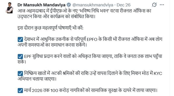 અમદાવાદના વટવામાં ઈપીએફઓની પ્રાદેશિક ઓફિસ ભવિષ્ય નિધિ ભવનના ઉદઘાટન પ્રસંગે કેન્દ્રીય શ્રમ પ્રધાન મનસુખ માંડવિયાએ તેમના સંબોધનમાં આ સમગ્ર માહિતી આપી હતી.