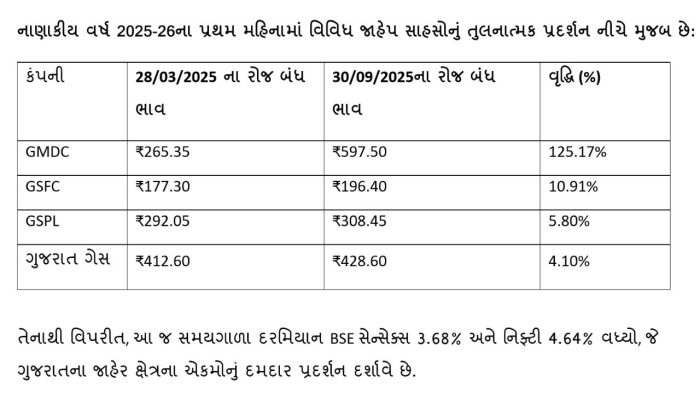ગાંધીનગર- ગુજરાતના જાહેર ક્ષેત્રના સાહસો- પીએસયુ(Gujarat PSUs)એ નાણાકીય વર્ષ 2025-26 ના પ્રથમ છ મહિનામાં શેરબજારમાં(Stock Market India) શાનદાર પ્રદર્શન કર્યું છે, અને BSE સેન્સેક્સ તેમજ NSE નિફ્ટી જેવા બેન્ચમાર્ક સૂચકાંકોને પાછળ છોડી દીધાં છે.